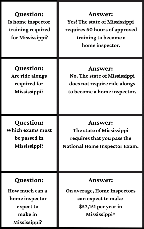 The state of Mississippi requires you take an approved 60 hour course to become a home inspector.