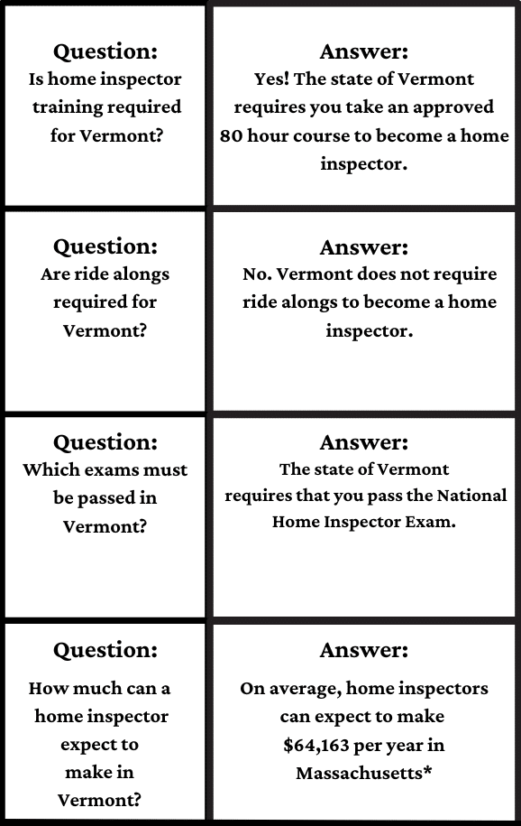To get your home inspector license, Vermont requires you to pass the national home inspector exam.
