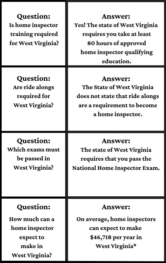 To get your home inspector license, West Virginia requires you to pass the national home inspector exam.